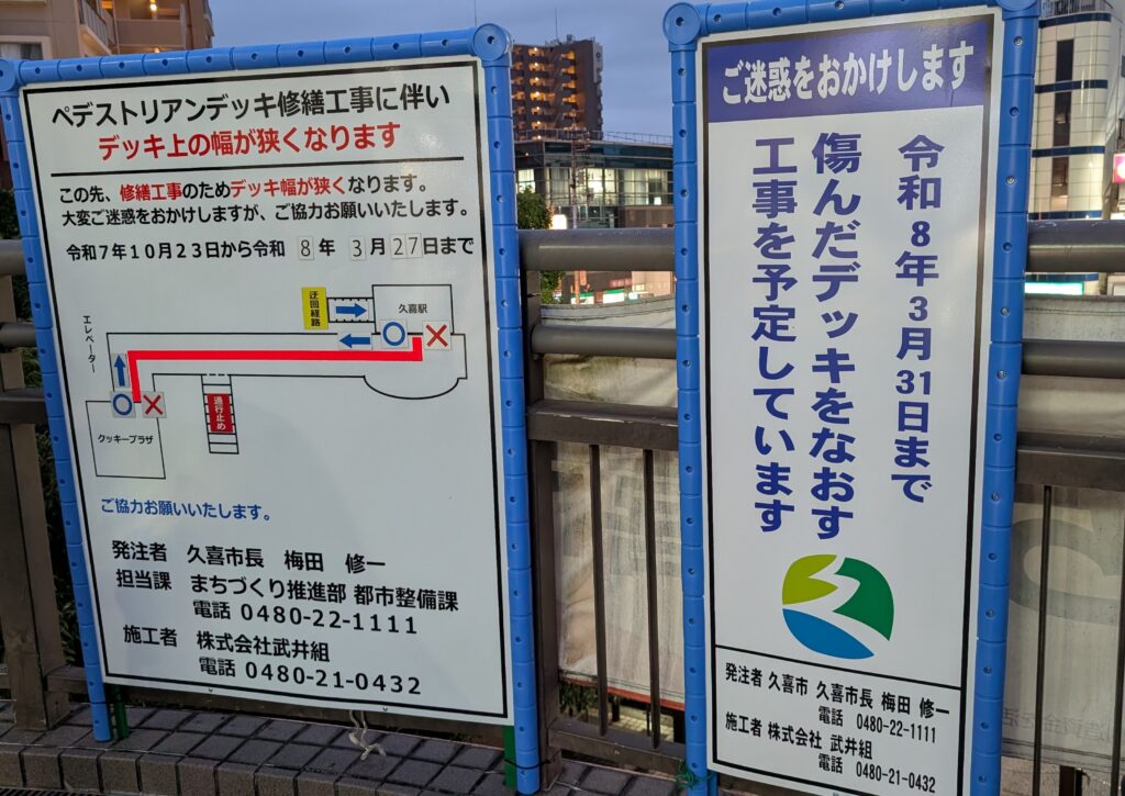 以前、コンクリート片の落下が相次いで質疑もしましたが、久喜駅西口駅前広場ペデストリアンデッキの補修工事が、ようやく「10月23日から」始まります!