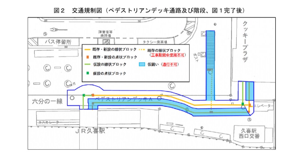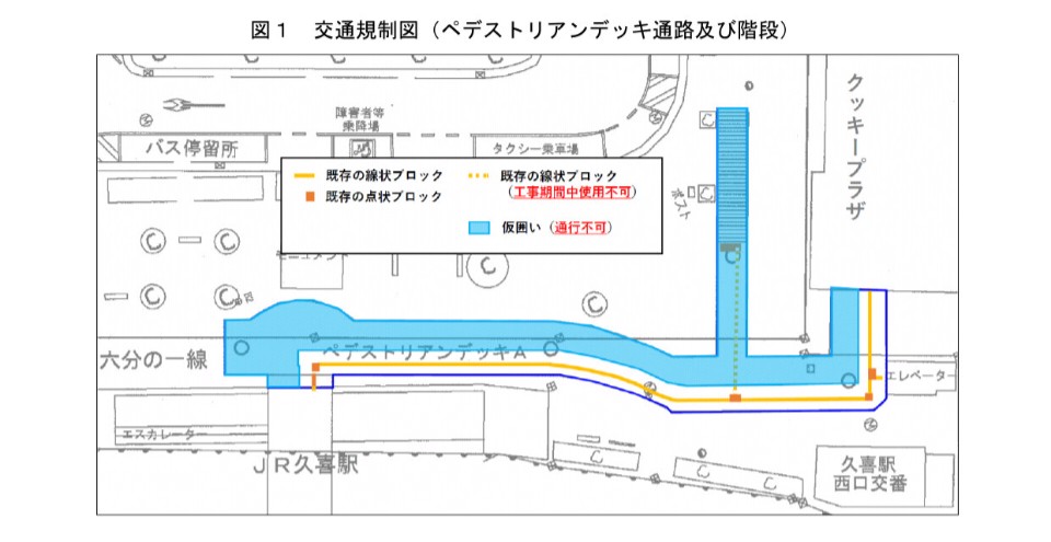 「デッキ通路及び階段の路面タイル張替えのため、通路は片側交互通行とし、階段は通行止めを行います。(図1、図2参照)