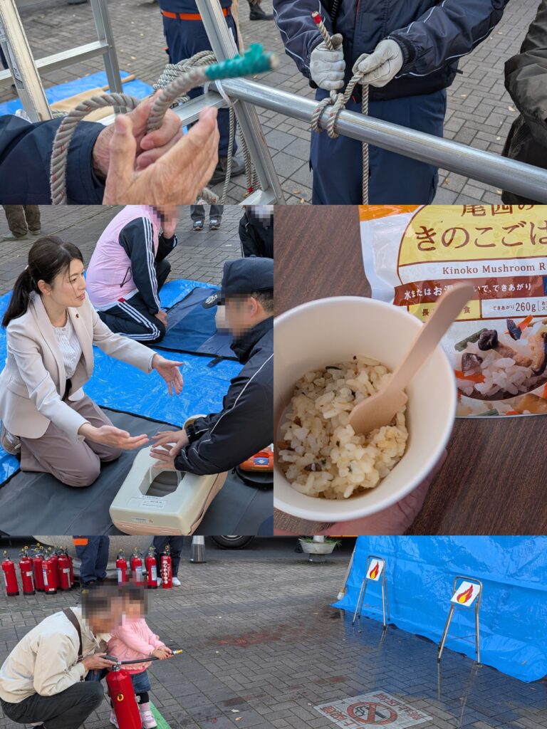 けむり脱出体験やロープワーク、消火訓練、非常食の試食など、今年も多くのコーナーを用意していただき、学びながらも自然と参加者さんと会話が生まれる雰囲気でした。